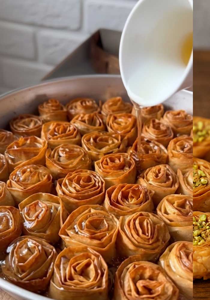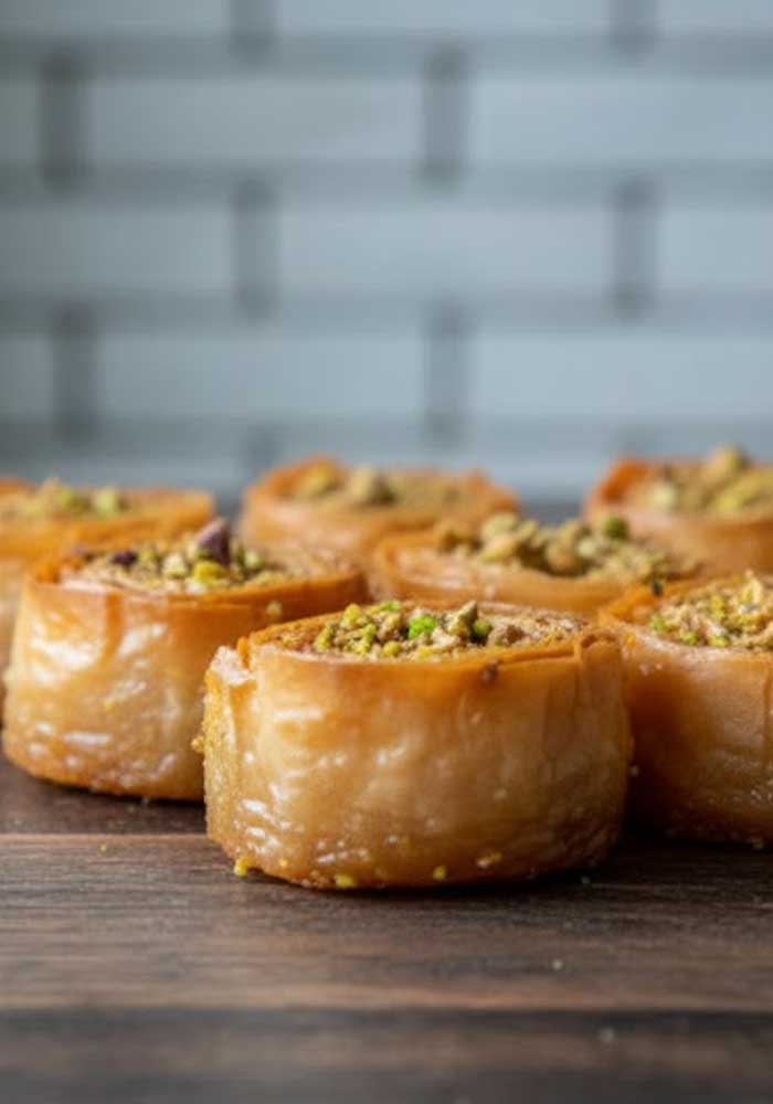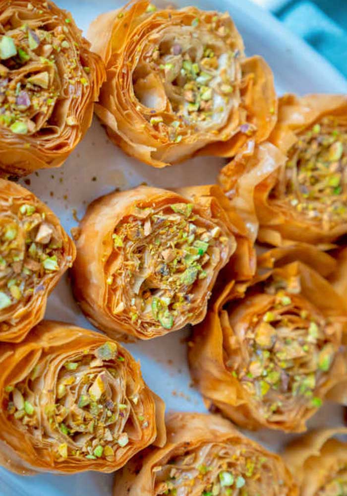A traditional buttery and crisp phyllo dough filled with either nuts or rich sweet cheese center.